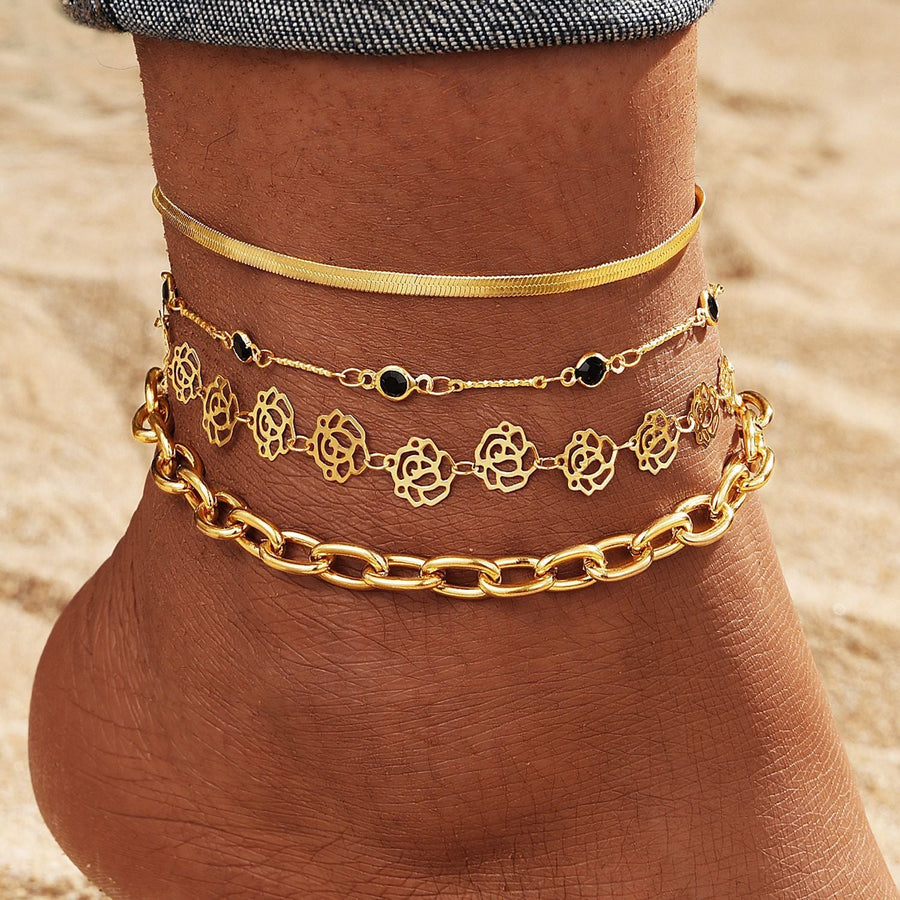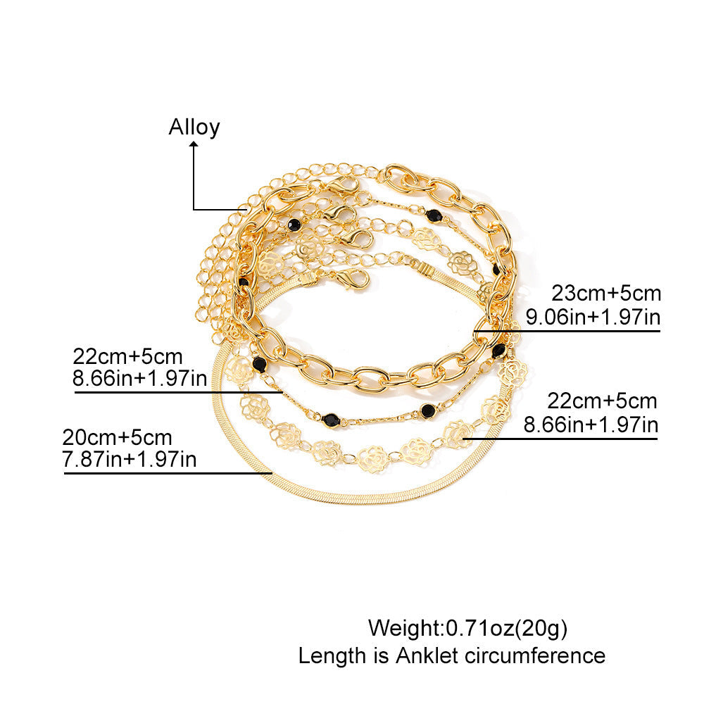 Snake Chain Rose Black Diamond Anklet 4-piece Set
