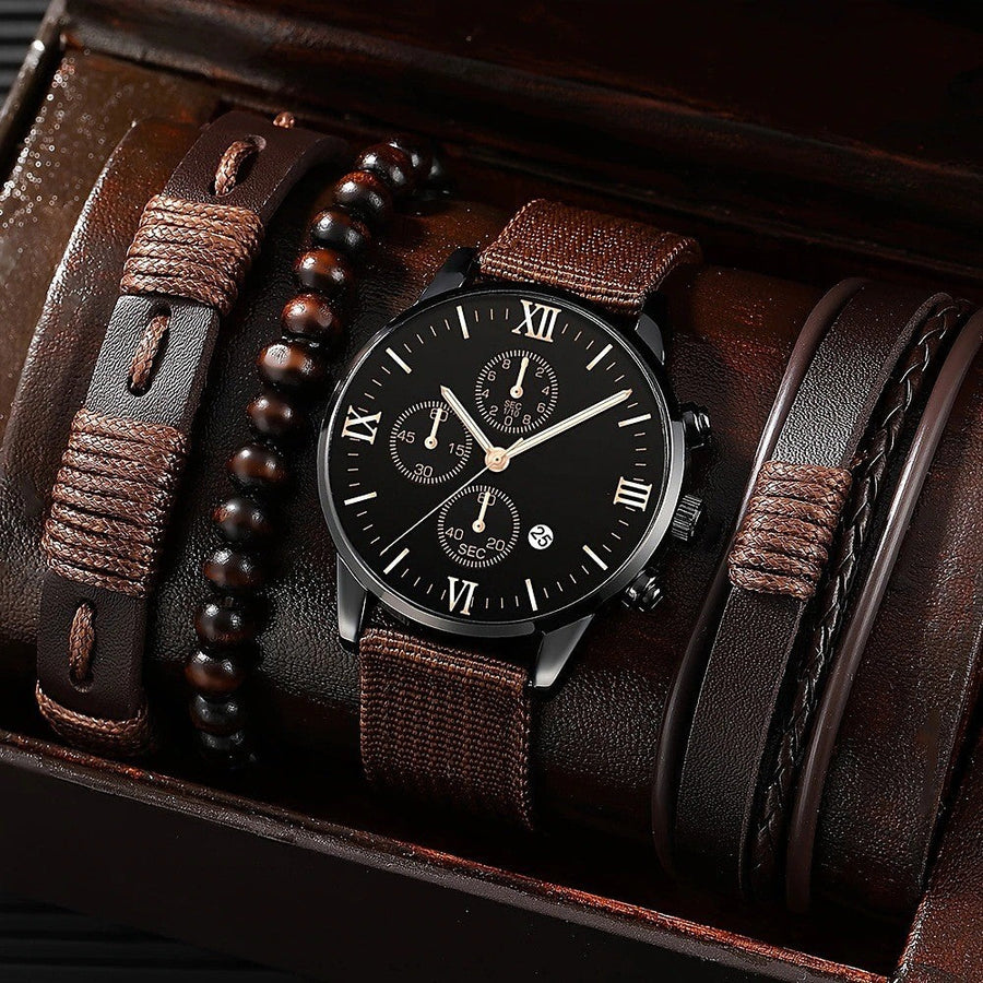 Single Calendar Fake Three-eye Canvas Quartz Watch Pu Bracelet Set